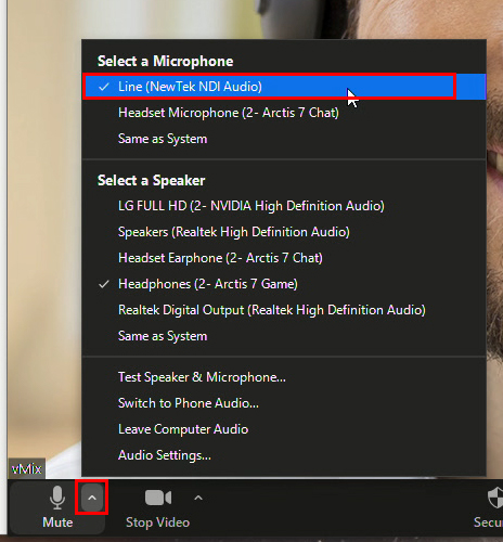Next we will configure the Zoom video source. Select the arrow next to the camera icon in the bottom left corner. Then choose the Newtek NDI Video option.