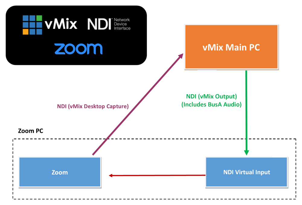 The below guide will explain how to use vMix and NDI to bring in a Zoom call from another PC or Laptop and also send them a return video and audio feed. If you have vMix 26 or below, this is the recommended method for best performance.